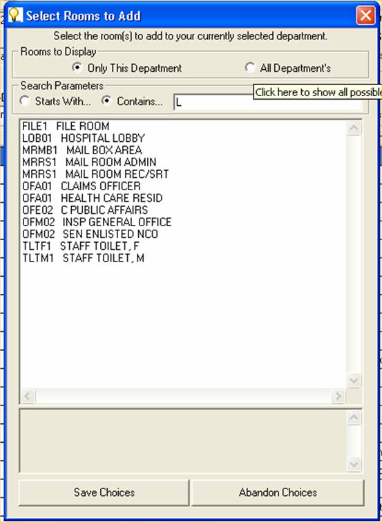 Figure 2: Adding rooms is now possible, choose from the current department 's rooms or from all possible rooms, quickly search all rooms You can add several rooms at a time to the current department PFD. You can switch between only the department room types of all Criteria Room Types on the fly, and back again. Search by Room Code (begins with) or by key work search. Just click on the list to pick a room, or two or more. The grey area shows the PFD line numbers from the criteria which are being added.