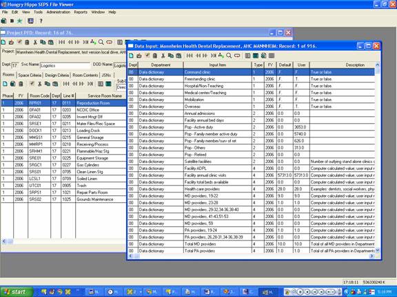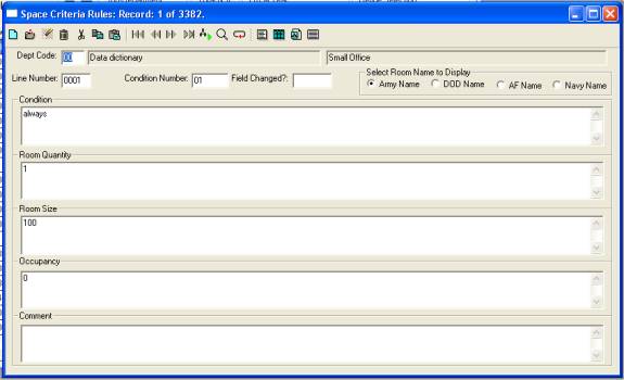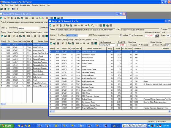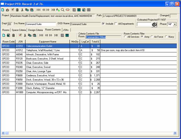 Figure 1: PFD Data entry screen, with tabs to get to applicable information Notice that the current departments total NSF is always displayed, and is updated dynamically as you edit the Qty and Room Size. The Total PFD NSF is available toward the top of the window. You can update this by clicking on the Gear Button. Switching phases, showing all (zero rooms) or switching to baseline from projected year is performed on the fly. NSF totals automatically reflect the correct phase, and fiscal year. Moving departments is done at the top of the window, using video style buttons. Cut and Paste is fully supported. Copy a comment from one room and paste it into each room, no more retyping the same comment.